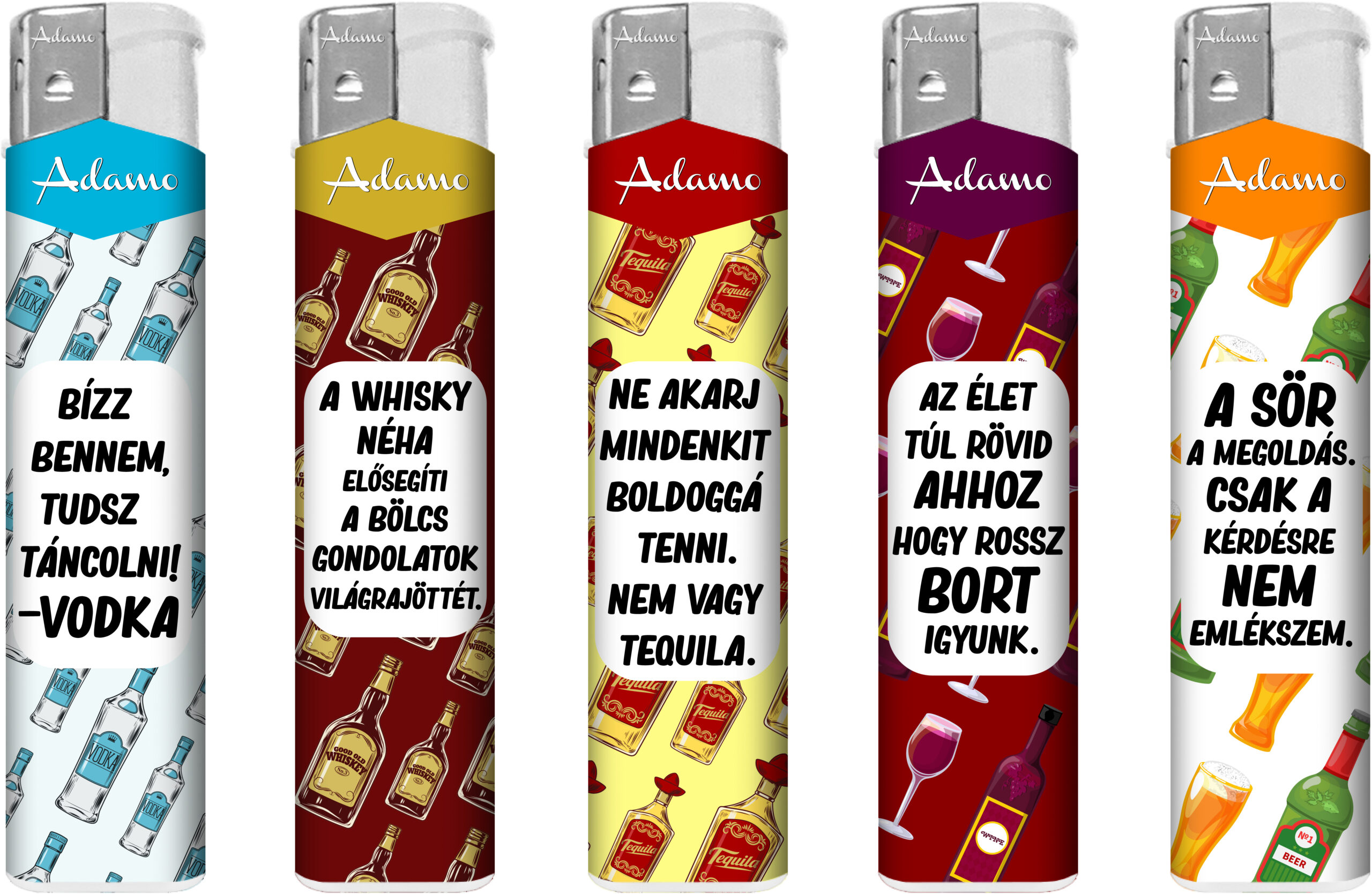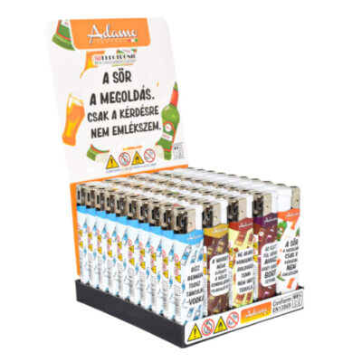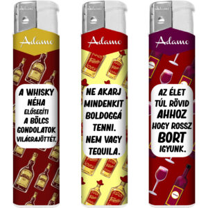 Vegyes mintás , vékony testű , állítható láng , újratölthető , vicces alkohol feliratok.